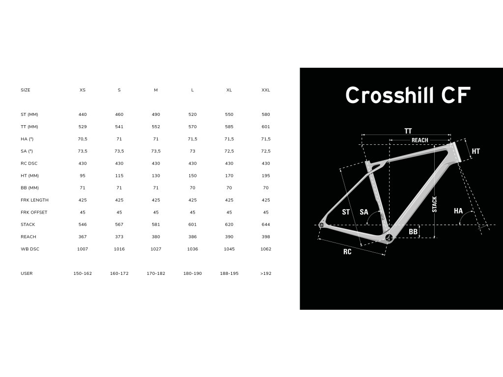 V rade Crosshill CF je sedem modelov, pričom dva majú odpružené vidlice so zdvihom 30 a 40 mm na náročnejšie použitie v horách alebo na kamenitých cestách. Nižšie modely sú vybavené mimoriadne pohodlnými hliníkovými riadidlami (rise: 12 mm, drop: 114 mm). Vyššie modely majú karbonové riadidlá, ktoré umožňujú športovejšiu pozíciu. Kabeláž vchádza do rámu už v predstavci, čo ničím nenarúša dokonalý vzhľad.